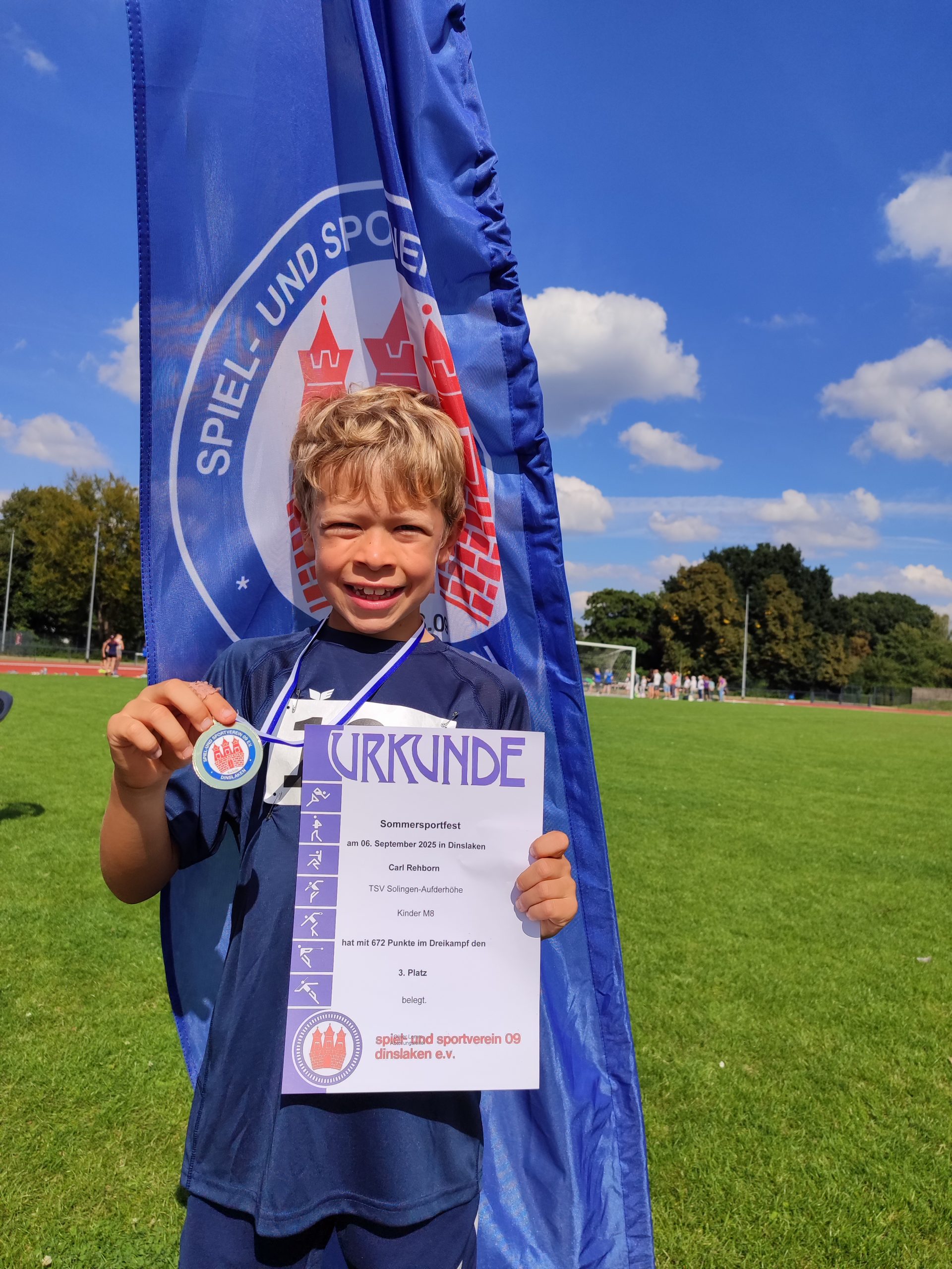 Zeitgleich startete Carl Rehborn beim Sommersportfest des SuS Dinslaken. Dabei belegte er in der M8 im Dreikampf den dritten Rang mit 672 Punkten, wobei er über 50 Meter in 9,44 Sekunden und im Weitsprung mit 3,02 Metern neue Bestleistungen aufstellte. Seine dritte Bestmarke an diesem Tag gelang ihm über 800 Meter in 3:20,42 Minuten, was den vierten Platz bedeutete.